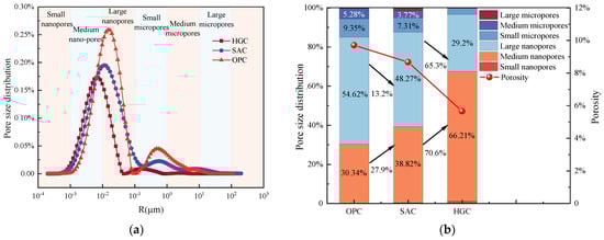 Figure 7a shows the pore size distributions of cured grout samples divided into two categories: nanopores and micropores. Three dominant subclasses emerge—medium nanopores (10–50 nm), large nanopores (50–100 nm), and small micropores (100–500 nm)—with most pores concentrated between 1 nm and 10 μm. HGC and SAC samples exhibit predominant medium nanopore distributions, contrasting with OPC’s large nanopore concentration.