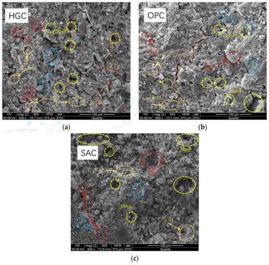 Microstructure of the different specimens. (a) HGC; (b) OPC; and (c) SAC.