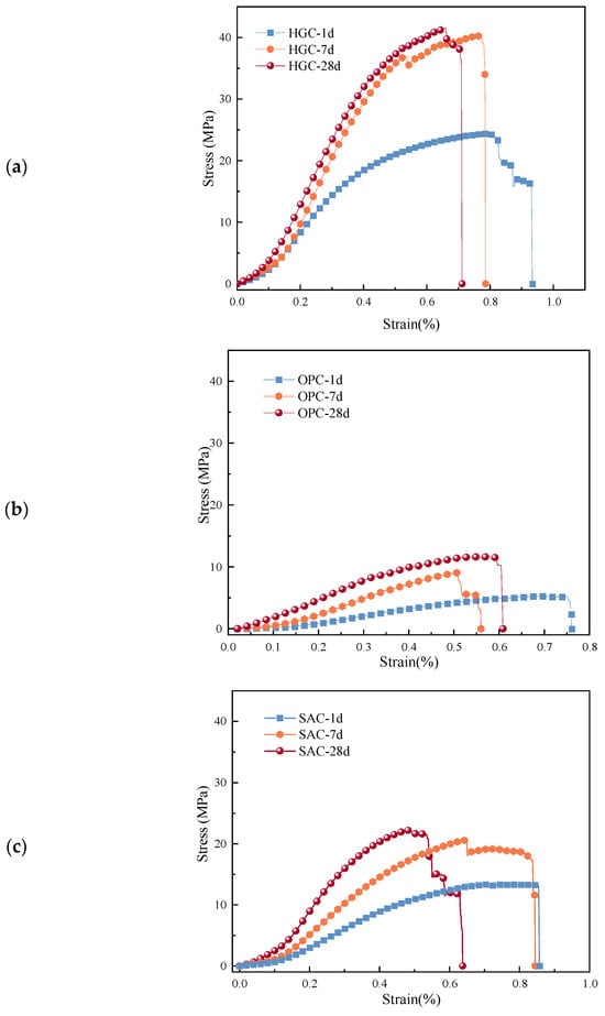 Stress–strain curves for different samples. (a) HGC cured grout; (b) OPC cured grout; and (c) SAC cured grout.