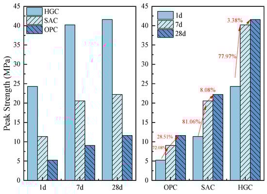 - The uniaxial compression tests demonstrated that the UCS of HGC, SAC, and OPC specimens exhibited a gradual decreasing trend across different curing ages. Compared with conventional cementitious materials, HGC showed faster UCS development during the initial 7 days, with a growth rate of approximately 77.97%. Regarding failure modes, both HGC and SAC specimens primarily failed through vertical splitting fractures while maintaining good post-peak integrity, whereas OPC specimens displayed typical brittle fragmentation failure characteristics.