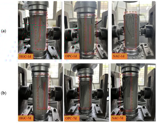 Intermediate-cured specimens (7-day, Figure 11b) exhibit lateral deformation-dominated failure with extensive surface spalling. HGC samples show upper-region crack concentration while preserving lower-section integrity, whereas OPC fails through large penetrating cracks. SAC demonstrates combined failure mechanisms: upper spalling and mid-height penetrating cracks synergistically cause structural collapse.