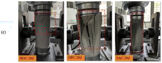 Figure 11c shows distinct failure modes for 28-day cured specimens: HGC exhibits vertical compression failure with localized upper-section lateral deformation and absent penetrating cracks; OPC demonstrates typical brittle splitting failure through mid-specimen penetrating cracks causing severe fragmentation; and SAC maintains intermediate-stage failure patterns dominated by lateral deformation.
