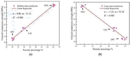 The 28-day uniaxial compressive strength (UCS) correlation analysis with NMR-derived pore size distribution focused on four critical pore categories: medium nanopores (10–50 nm), large nanopores (50–100 nm), small micropores (100–500 nm), and medium micropores (500–1000 nm), excluding minor small nanopores (<10 nm) and large micropores (>1000 nm), which collectively accounted for <3.5% total porosity. Experimental data established quantitative relationships between these dominant pore ratios and UCS values, as systematically presented in Figure 12.
