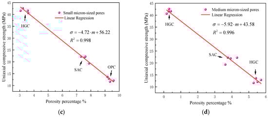 Relationship between UCS and pore size proportion. (a) Medium nano-sized pores; (b) large nano-sized pores; (c) small micron-sized pores; and (d) medium micron-sized pores.