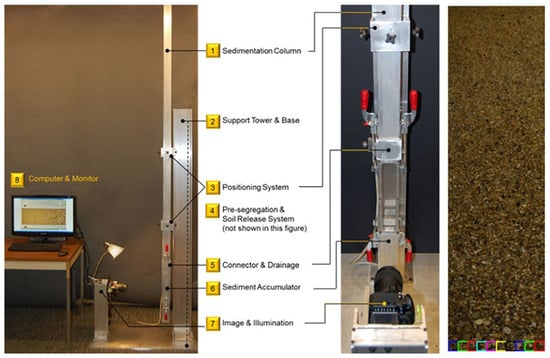 Mechanical sieving remains the most commonly used particle sizing method due to its simplicity [,,]. However, it is labor-intensive, time-consuming, and sensitive to sample disturbance [,,,,,]. To overcome these drawbacks, Ohm and Hryciw [] developed the Sedimaging system, which estimates particle size by analyzing image textures using wavelet transformation [,,,,]. As shown in Figure 1, the system includes a transparent sedimentation column, backlighting, and a high-resolution camera that records particles as they settle in water. Texture features extracted from the images are used to estimate particle size via wavelet-based granulometry. This approach works well for particles smaller than 2 mm. However, for larger particles, internal textures interfere with the wavelet analysis, reducing accuracy [].