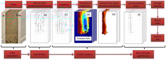 To overcome this limitation, a new algorithm was proposed to estimate soil particle sizes based on the principle that larger particles fall faster under gravity. The overall framework of the algorithm, illustrated in Figure 2, includes three key steps: (1) optical flow estimation from sedimentation video frames; (2) extraction of laminar flow zones using global motion analysis with streaklines and potential functions; and (3) back-calculation of particle size using Stokes’ Law. In this context, we distinguish between two flow types: laminar flow, characterized by vertical downward motion, and turbulent flow, which involves multidirectional movement and rebounds near the base. The framework allows reliable segmentation of laminar regions and accurate estimation of settling velocities for size inference.