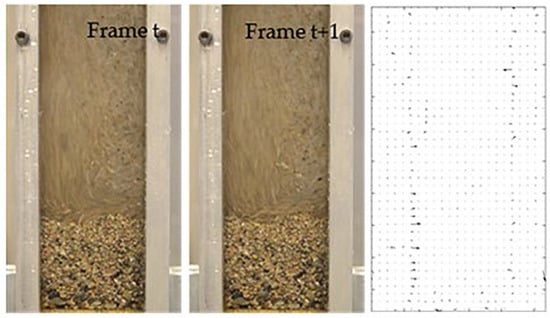 where k denotes the iteration number, and and are the neighborhood averages of uk and vk. As an initial step, the classical Horn and Schunck method was applied due to its simplicity and analytical clarity. Two consecutive frames were selected from the recorded video to estimate the optical flow field. The resulting motion vectors, illustrated in Figure 3, reveal that the classical model fails to capture the large displacements characteristic of falling soil particles.