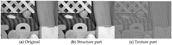 The data term assumes that the intensity value of pixel remains unchanged during its displacement to . However, this assumption often fails in practice due to sensor noise, illumination changes, reflections, and shadows. Weijer et al. [] and Mileva [] attempted to resolve this by using photometric invariants, which inherently require color imagery. A more common strategy in grayscale settings is to replace raw intensity values with image gradients to improve robustness against illumination variations. However, this introduces multiple data fidelity terms and second-order derivatives, which tend to amplify noise artifacts []. To mitigate the effects of lighting changes, shadows, and specularities, we adopted a decomposition into structure and texture components following Wedel et al. []. Given a greyscale image , the structural component is obtained by minimizing the following energy functional: