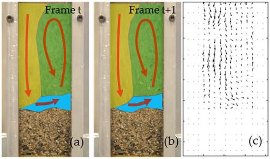 Using the improved model described above, we recomputed the optical flow between the two frames shown in Figure 2. The resulting displacement ranged from u = −44.36 (left) to 37.43 (right) pixels, and from v = −44.37 (upward) to 50.14 (downward) pixels. Ideally, the horizontal component u should remain close to zero, and the vertical component v should be strictly positive, reflecting a purely downward motion. However, visual inspection of the video indicates that the soil particle motion can be divided into three distinct regions, as illustrated in Figure 5. The yellow region represents laminar flow, where particles fall vertically downward. Upon impact with the base, particles rebound and ascend, forming the blue region. Subsequently, they enter the green region, where trajectories become irregular and recirculating, indicating the presence of turbulent flow. As a result, particle velocities exhibit multidirectional behavior. The computed velocity field in Figure 5c captures this qualitative pattern. However, due to the absence of ground-truth optical flow data for the selected frame pair, the quantitative accuracy of the results remains uncertain.