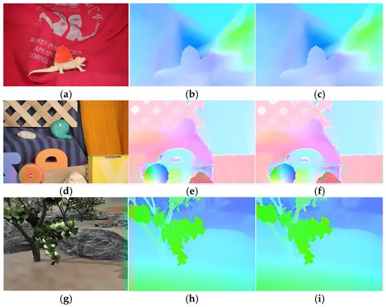 Middlebury optical flow evaluation results. (a) “Dimetrodon” sequence; (b) Ground truth; (c) Calculated result; (d) “RubberWhale” sequence; (e) Ground truth; (f) Calculated result; (g) “Grove2” sequence; (h) Ground truth; (i) Calculated result.