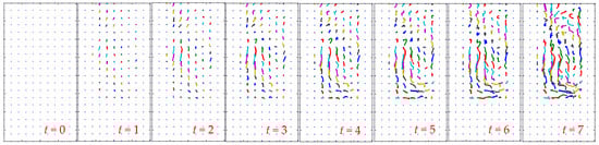 A fourth-order Runge–Kutta–Fehlberg method, combined with cubic interpolation of the velocity field [], is employed to solve the system. The computed streaklines over seven successive frames are shown in Figure 7. These streaklines successfully capture the underlying flow pattern previously illustrated in Figure 5.