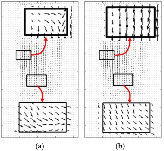where A is the coefficient matrix composed of the interpolation weights ai and U is the vector of initial horizontal velocities ui derived from optical flow. The streak flow component us is obtained as the least-squares solution to Equation (10). Figure 8 compares the velocity fields computed using classical optical flow and the refined streak flow. Noisy motion vectors, likely caused by rebounding particles, are highlighted in the black box. In contrast, the streak flow produces a smoother velocity field. In this field, such spurious motions are effectively suppressed. This refined field enables more accurate characterization of flow behavior through potential function analysis.