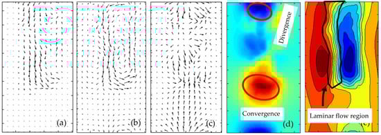 An implementation result is presented in Figure 11a, where the velocity field is segmented into six distinct regions. Regions (1) and (2) correspond to laminar flow, characterized by particles falling vertically downward. Regions (3), (4) and (5) are identified as turbulent zones, where particles exhibit recirculating and multidirectional motion. Region (6) also represents laminar flow, but the particle motion is predominantly upward.