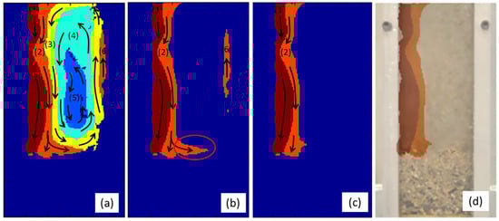 Based on the velocity potential ϕ, Regions (3), (4), and (5) are removed because they do not exhibit downward motion. The resulting filtered field is shown in Figure 11b. However, when falling particles strike the bottom of the container, they rebound, generating horizontal motion. This behavior accounts for the strong lateral velocities observed in the red-circled area of Figure 11b. Similarly, the upward motion in Region (6) results from rebound-induced turbulence.