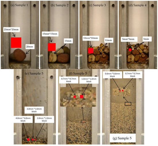 In all experiments, a particle density of 2600 kg/m3 was assumed, which represents the typical density of quartz-based soil aggregates in geotechnical applications. This value was used in Stokes’ law to calculate the equivalent particle diameter based on settling velocity. The implications of this assumption, along with the upper tracking limit of the imaging setup, are further discussed in Section 6.