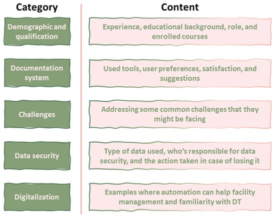 The interview framework comprised 22 questions, as outlined in Table 1. The initial five questions (Q1–Q5) aimed to gather demographic information, including job title, education, and experience. Q6 was designed to pinpoint the prevailing tools and software in the AM/FM industry in the UAE. Q7–Q9 delved into perspectives on document types, actionability, and employee satisfaction, exploring the need for potential changes. Q10 sought employee input on speeding up locating specific documents. Questions Q11–Q16 explored challenges and hurdles workers face in facilities management, identifying diverse problem-solving approaches companies employ to uncover innovative methods. Q17 aimed to ascertain the type of information exchanged in the process, while Q18–Q20 focused on measures taken to ensure the safety of exchanged information. Q21 directly inquired about participants’ awareness of BIM or DT technologies. The final question, Q22, held particular significance, prompting participants to contemplate an example illustrating how automation could enhance facility management tasks.