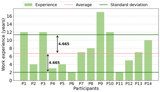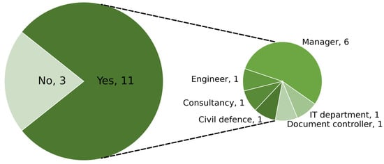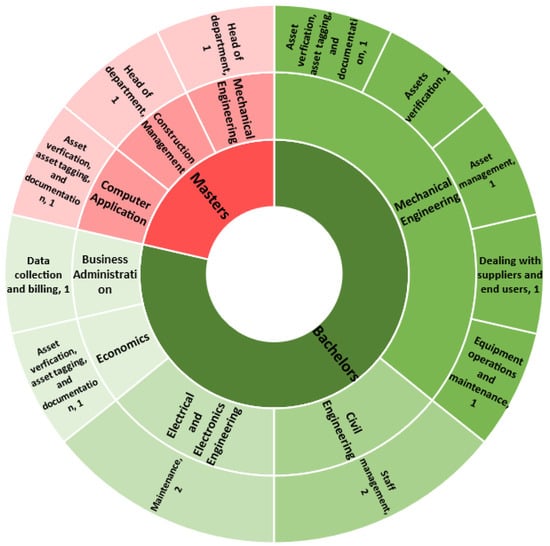 As depicted in Figure 2, the interviewees’ experience is diverse, with a mean experience of 6.7 years. These varying experience levels offer valuable insights into generational disparities and the impact of accumulated experiences on an employee’s adaptability to changes. To encompass this diversity, we intentionally selected participants with a spectrum of experience, ranging from a minimum of one year to a maximum of seventeen years. Furthermore, these interviewees had diverse educational backgrounds. Out of 14 candidates, 3 held a master’s degree and two held positions as heads of departments (Figure 3). The majority of participants had a background in mechanical engineering, with four individuals holding a diploma in mechanical engineering, with one having a master’s degree in the same field and one serving as a mechanical technician. This subgroup constitutes nearly 43% of the total participants. Following closely is the field of civil engineering, represented by two individuals with a diploma and one with a master’s degree, making up approximately 21.4% of the participants. The remaining participants have diverse educational backgrounds, including business administration, economics, and electrical engineering. Their roles encompassed various responsibilities, including equipment operations, supplier interactions, asset verification, asset tagging, documentation, staff management, and basic maintenance.