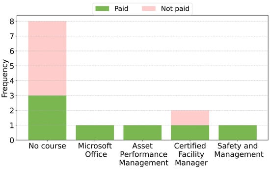 Given the increasing demand for ongoing learning in the professional sphere, our analysis aimed to assess the participants’ uptake of professional development opportunities, particularly in FM. According to LinkedIn’s 2019 Workplace Learning Report, 74% of employees expressed a keen interest in enhancing their skills during their free time [30]. Consequently, we investigated whether participants had pursued courses related to AM/FM, the nature of these courses, and the sponsorship details. The responses reveal that 57% of companies were inclined to cover course expenses for their employees. Notably, among companies that did not provide financial support, a substantial 85.7% of workers did not partake in any courses, in contrast to just 28.6% of employees in companies offering financial assistance. Most participants did enroll in various courses, covering topics such as Microsoft Office, asset performance management, safety, and certified facility manager (Figure 4).