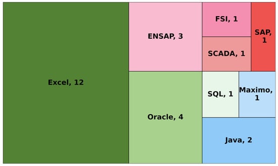 Documentation of asset information is a crucial aspect of how asset data are stored, retrieved, accessed, and maintained. Investigating the documentation system of asset management practices is essential to understand the related challenges, such as difficulties in accessing information, inaccuracies, and time-consuming processes. Additionally, the maintenance of comprehensive documentation serves to pinpoint areas in need of improvement, ultimately facilitating quality enhancement and process optimization. Based on the responses to Q6, which investigates the tools/software used for documentation, Microsoft Excel emerges as the most prevalent choice for documentation, constituting 46% of the mentioned software (Figure 5). Following closely is Oracle at 15.4%, ENSAP at 11.5%, and Java at 7.7%. Several other tools were mentioned once, including SQL, Maximo, SAP, FSI, and SCADA.