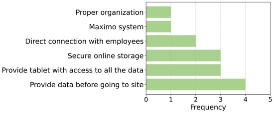 Participants were encouraged to take their time to contemplate the possibilities. A diverse array of intriguing responses emerged. Half of the participants expressed a desire to automate the data collection process from sites, highlighting the inefficiency of the current manual approach, which involves navigating, seeking approvals, and entering physically challenging locations. Meanwhile, 14.3% of respondents emphasized the challenges associated with manually collecting bills, storing them for extended periods, and comparing prices, citing the potential for human errors in this process. Another 14.3% identified the need for automation in preventive maintenance tasks. Some participants underscored that automating data updates and communication could free employees to channel their energy into other responsibilities, thereby saving time and effort, as depicted in Figure 16.