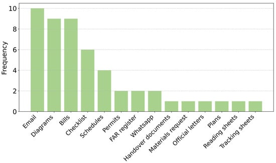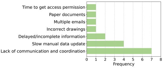 By directly probing the challenges within the facility management process, we gleaned insights into the prevalent obstacles impeding its efficiency. As depicted in Figure 8, various challenges were discerned, encompassing issues such as struggles with access permissions, handling paper documents, navigating through numerous emails, and encountering inaccuracies in drawings. Notably, 41.2% of the identified challenges were attributed to deficiencies in communication and coordination. This high proportion underscores a systemic issue in how information flows across departments and stakeholders. Ineffective communication can lead to redundant efforts, misinterpretation of tasks, and delays in operations, especially in large-scale or multi-site facilities. The next significant challenge (responded by 23.5% of participants) pertains to sluggish manual data updates. This manual approach is not only time-consuming but also error-prone, limiting the ability to maintain real-time, accurate operational data. In addition, 11.8% of challenges were linked to delays in obtaining or incomplete information. Furthermore, a substantial 85.8% of participants manually updated information and data, indicating minimal automation or digitization in current workflows. Only 7.1% utilized scanners for this purpose, and an equivalent percentage had their information entered by software engineers.