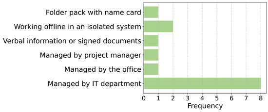 Participants were queried about the types of information utilized in facility management. The most prevalent response among participants was emails, with 71.4% mentioning it, representing 20% of the total (Figure 12). Following closely were diagrams and bills, cited by 64.3%, each accounting for 18% of the answers given. Information exchange tools such as checklists, schedules, permits, FAR registers, sheets, and WhatsApp group chats were also frequently mentioned. In contrast, handover documents, materials requests, official letters, and plans were mentioned only once, as illustrated in Figure 12. Regarding strategies for ensuring the security of collected data, most participants exhibited uncertainty or lack of confidence in their responses. Among those who highlighted email and WhatsApp as common data-sharing methods (representing 71.4% of participants), the responsibility for data protection was attributed to either the IT department or the project manager, as shown in Figure 13. A smaller percentage (14.3%) proposed that working offline in an isolated system might enhance data protection. Conversely, technicians suggested utilizing folders containing name cards, verbal information, or signed documents.