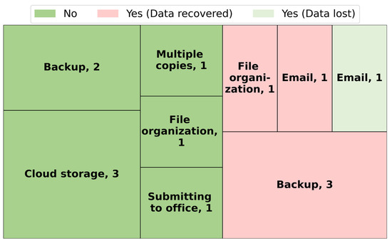 Regarding data loss, a majority, i.e., 57.1%, responded negatively, while 42.9% acknowledged experiencing data loss (Figure 14). Among those who encountered data loss, 83.3% successfully recovered the data with assistance from the IT department, while 16.7% could not. A total of 35.7% of participants suggested having a backup to reduce the risk of data loss. Additionally, 21.4% endorsed Cloud storage as a solution. A further 14.3% believed that using email to share information might mitigate the risk, reasoning that it would be stored there in the event of drive failure. Another 14.3% emphasized the efficacy of simply organizing files in safeguarding data. Some participants also proposed creating multiple copies of files or submitting collected data directly to the office during site work to minimize risks. The responses reveal that cloud storage users are less likely to experience data loss, and those who regularly create backups reduce the likelihood of data loss and find recovery a straightforward process. Email emerged as the sole case where participants faced challenges in data recovery.