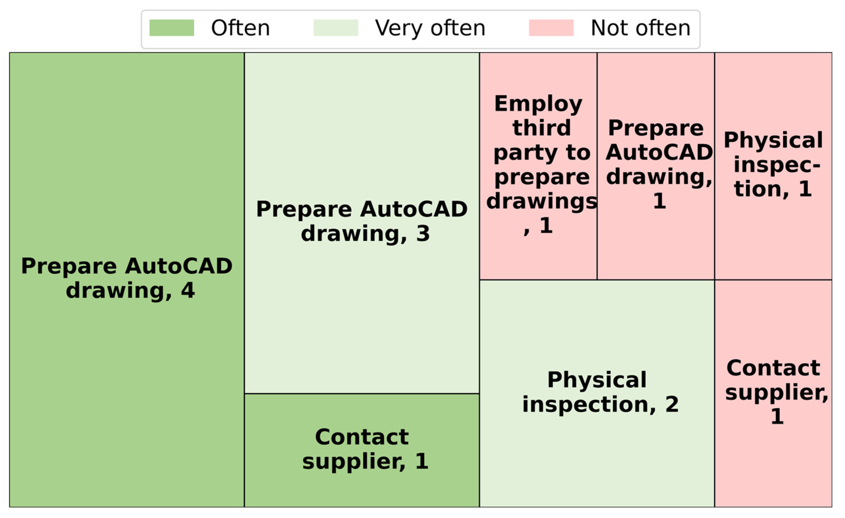 Drawing from the participants’ experiences, it appears that 71.4% have encountered the issue of drawings not aligning with reality. Among them, 50% believe this discrepancy occurs frequently, while 28.5% have not faced such a situation and consider it infrequent. Regarding the measures taken in such cases, participants mentioned contacting the supplier, creating an AutoCAD drawing, or conducting a physical inspection (Figure 11). A significant 64.3% of participants emphasize the necessity of preparing AutoCAD drawings, while 21.4% believe that physical inspection suffices in most instances.