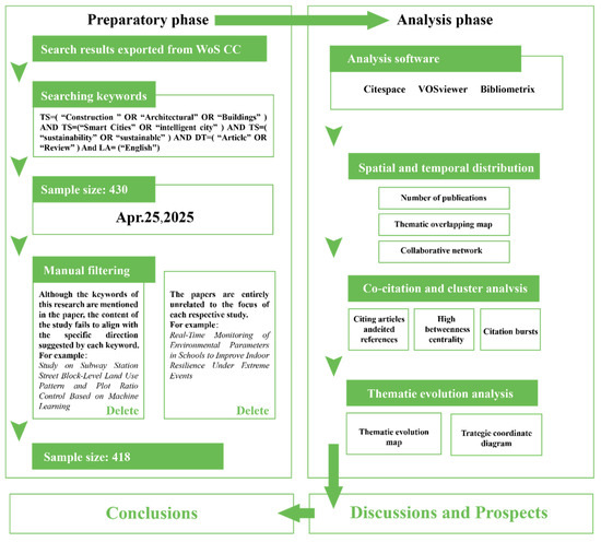 The research methodology employed in this study involved a comprehensive approach to data collection and selection. The first step was to conduct a review of references from the Web of Science Core Collection (WoS CC), a trusted and reliable source of high-quality citation data [29]. In the second step, the goal was to gather relevant database records. Papers were selected from academic journals present in multiple databases related to the research topic, based on specific inclusion criteria. The search was conducted in the WoS CC subject field using the following search terms: (TS = (“Construction” OR “Architectural” OR “Buildings”) AND TS = (“Smart Cities” OR “Intelligent City”) AND TS = (“Sustainability” OR “Sustainable”) AND DT = (“Article” OR “Review”) AND LA = (“English”)). Bibliometric studies indicate that articles and reviews are more pertinent to research than conference proceedings or book reviews. The third step involved a rigorous screening process to ensure the relevance of the selected references. A total of 430 articles were initially extracted and reviewed to confirm they met the inclusion criteria. Each article was carefully read and analysed to assess its alignment with the study’s focus. Papers that did not address the central themes or conclusions of the research were excluded, even if they contained occasional keywords relevant to the topic. Following this screening process, 418 papers were retained for further bibliometric analysis (Figure 1).