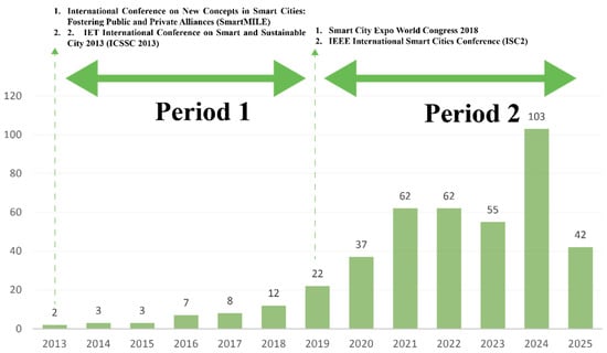 During this period, the number of publications increased steadily, though at a relatively slow pace, with the maximum annual publication count not exceeding 23. Following key events, such as the International Conference on New Concepts in Smart Cities: Fostering Public and Private Alliances and the IET International Conference on Smart and Sustainable Cities in 2013, attention shifted towards the sustainable development of urban buildings. The integration of information and communication technologies (ICTs) created significant opportunities to enhance urban infrastructure, including buildings [33,34]. Furthermore, the potential of emerging technologies to promote sustainability within urban building communities became a critical focus in the planning and implementation of smart cities [35]. These studies provided valuable insights into the possibilities for sustainable architectural development within the broader context of smart city construction.