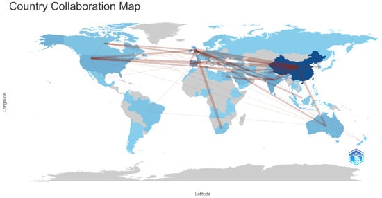The country cooperation map illustrates the global distribution of publications and the collaborative relationships between countries and regions (Figure 3). Darker areas on the map indicate higher publication volumes, with China making the most significant contribution to research in this field, followed by the UK, France, Australia, and others. Thicker lines represent stronger collaborative ties, such as those between China and the UK, the UK and South Africa, and the US and China.