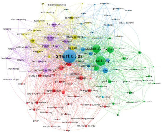 The co-occurring keyword analysis categorises the literature into five distinct groups, each corresponding to a specific research theme (Figure 4). The blue cluster represents the broader context of this study, encompassing terms such as “smart cities”, “systems”, “innovation”, and “technology”. These keywords highlight a focus on management systems and emerging technologies, indicating that building sustainability within smart cities is a complex, interdisciplinary challenge requiring a multifaceted approach. The green cluster reflects the central objective of this research, with “sustainability” linked to “energy”, “impact”, and “urbanization”. This grouping underscores the interdependence between the development of smart cities and the transformation of urban buildings. The red cluster focuses on key strategies for ensuring the sustainable development of buildings within smart cities, with “building design” emerging as a direct method of implementation. It also highlights the role of artificial intelligence in optimising building performance, particularly in enhancing energy efficiency and facilitating demand response. The yellow cluster examines the impact of emerging technologies on building sustainability, placing particular emphasis on “big data management” as a critical factor. Finally, the purple cluster explores future opportunities and challenges related to building sustainability within smart cities, suggesting that advances in Internet infrastructure could lead to significant breakthroughs and transformative developments in this field.