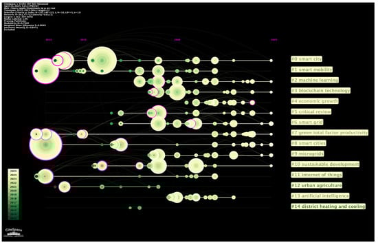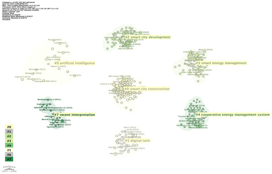 CiteSpace cluster analysis identified seven distinct clusters, each demonstrating strong internal coherence (modularity Q = 0.8755) and moderate similarity between clusters (S = 0.9327). These clusters, illustrated in Figure 5, exhibit a well-structured framework and satisfactory inter-cluster similarity (Table 2). The most influential clusters were smart city construction (cluster #0), smart city development (cluster #2), and smart energy management (cluster #3), with smart city construction emerging as the most critical cluster. An analysis of the average formation time revealed that smart city construction (cluster #0), digital twins (cluster #5), and artificial intelligence (cluster #9) are the most recent developments. In contrast, the recent interpretation cluster (cluster #7) had an earlier formation date.