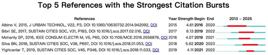 This study examines the impact of specific publications in the field of building sustainability within smart cities, particularly those that have experienced a significant and rapid increase in citations, a phenomenon known as a “citation explosion”. This surge in citations reflects the growing interest and importance of a particular research area. Two main types of articles exhibit the highest citation rates (Figure 7): review articles and theoretical articles. Review articles provide comprehensive overviews and theoretical perspectives on sustainable buildings in smart cities, making them highly influential and frequently cited. Notable examples include works by [27,53,67]. In contrast, theoretical articles focus on defining the concept of smart cities, exploring their various dimensions, and developing research methodologies. Examples of such works include studies by [68,69]. These theoretical contributions are essential in advancing the understanding of sustainable development within the context of buildings in smart cities.