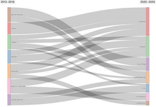 Figure 8 presents a visual representation of the evolution of research themes, illustrating the interconnections between these themes and their various developmental trajectories within the field. Each node on the left and the right side of the figure represents a set of research themes, with the size of the node reflecting the volume of related articles. Solid lines connecting the nodes indicate shared significance between the themes, signalling the mainstream evolution of the research. The thickness and colour of the lines represent the degree of similarity between topics, with darker and thicker lines indicating stronger connections. The figure highlights the emergence of new research areas over time, emphasising the dynamic nature of the field. Notably, the term “Internet” emerged as the most significant keyword during this evolution, reaching its peak prominence in the second phase. Concurrently, research related to “Cities”, “Models”, and “Design” began to converge into the domain of the Internet. The connection between “Design” and “Buildings” has strengthened, highlighting the central role of design practices in the development of buildings in smart cities. Furthermore, research on “Cities” and “Models” is increasingly aligning with “Buildings”. Sustainability remains a key theme across both phases, underscoring that environmental protection and sustainability will continue to be central priorities in the future of architecture and urban planning.