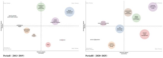 Figure 9 visually illustrates the evolution of building sustainability research within the context of smart cities. The research themes are categorised into four quadrants of a strategic map, based on two key factors: centrality (the degree to which a theme is connected to other clusters) and density (the cohesion of keywords within a cluster). This categorisation highlights the key research hotspots in the field. Each circle on the map represents a research topic, with its size reflecting the frequency of related keywords. The top-right quadrant, labelled Motor Themes, encompasses driving themes that are well developed and critical to the field, such as image recognition in cultural heritage. The top-left quadrant, Niche Themes, contains highly specialised and relatively isolated topics that have attracted fewer researchers. The bottom-left quadrant, Emerging or Declining Themes, includes relatively underdeveloped themes that generally follow the thematic trajectory of the other quadrants. The bottom-right quadrant, Basic Themes, features topics with high centrality but low density, which could emerge as future research hotspots. In the first phase, most research themes were in an exploratory stage, characterised by low density and relative isolation. Notably, topics such as Framework System Smart Cities and Design Management Architecture and Model Systems for Residential Buildings began to garner attention, signalling new directions with growing academic interest and influence. In the second phase, the further development and deepening of core themes provided a more solid foundation for building sustainability research within smart cities. Topics like Design System Technologies, Sustainability Impact Consumption Models, and Building Performance Models emerged as key areas of focus. The high proportion of research conducted on Internet Cities Management has since paved the way for the future evolution of these themes. These topics have now become central drivers of smart city and building sustainability research, offering significant practical implications and applications.