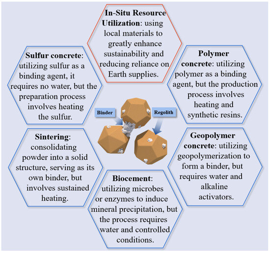 Against this backdrop, ISRU has emerged as a key strategy for reducing the dependency on Earth-sourced materials for extraterrestrial construction. ISRU involves the extraction and conversion of local resources found on celestial bodies, such as the Moon or Mars, into usable construction materials and other vital resources. The development of ISRU technologies is essential for achieving long-term habitation on extraterrestrial surfaces, as it enables the creation of infrastructure, the production of life-supporting resources like oxygen and water, and the manufacture of fuel—all from locally sourced materials [6,7,8,9,10]. By leveraging the natural resources available in space, ISRU not only minimizes the need for costly resupply missions from Earth but also promotes sustainability in space missions. Unlocking the full potential of ISRU will enable future missions to become more autonomous and cost-effective, ultimately facilitating human expansion into the cosmos.