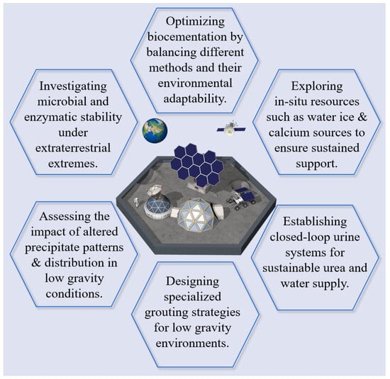 In the practical application of space construction materials, it is particularly important to recognize that any material intended for use in inhabited extraterrestrial environments must comply with stringent health standards [105]. Future research should incorporate health risk assessments into the evaluation of ISRU-derived construction materials. The discovery and efficient utilization of in situ resources on the Moon and Mars could significantly enhance the feasibility of biocementation. Future research should explore how to obtain and utilize these resources sustainably in extreme environments, advancing space construction and resource management. Additionally, combining biocement with other existing materials may address the limitations of single-material approaches, ultimately improving the overall performance of construction materials under extreme space conditions and enabling the expansion of extraterrestrial habitats, as illustrated in Figure 3.