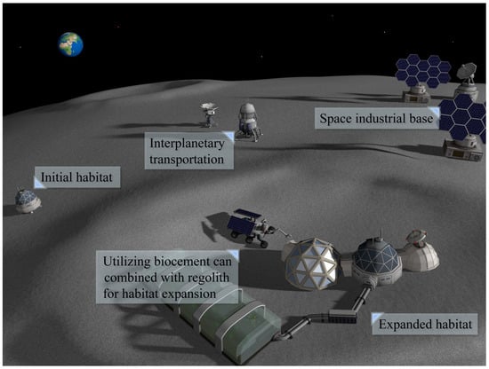 This review examines the latest developments in ISRU-based construction technologies for space applications, as illustrated in Figure 1, with a particular focus on the advancements in biocementation. By analyzing current research trends and exploring the challenges and opportunities associated with biocement in space environments, this review aims to provide valuable insights for future research in extraterrestrial construction and geotechnical engineering. Through continuous technological innovation and interdisciplinary collaboration, we believe humanity will ultimately achieve stable and enduring extraterrestrial settlements, laying the foundation for new homes in the vast expanse of the universe.
