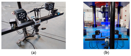 The stress–strain test of SC under uniaxial compression was performed using the YAW-15000F electro-hydraulic servo multifunctional structural test system (Popwil Instrument Co., Ltd., Hangzhou, China) and the XTDIC-3D non-contact full-field strain measurement system (XTOP 3D Technology Co., Ltd., Shenzhen, China), as seen in Figure 4a,b. To reduce the occurrence of pseudo-strain [39,40], the loading rate of 0.2 mm/min was maintained throughout the uniaxial compression test. The detailed procedure for the uniaxial compressive stress–strain test is shown in Figure 4c. Following the preparation of the specimen and the setup of the hardware, the pre-pressure test was conducted. According to the GB/T 50081-2019 [38], the specimen was compressed at the rate of 0.6 mm/min until a load of 220 kN was reached. Similar to the strain data collection methods employed by Zhou et al. [41] and Wang et al. [42], Digital Image Correlation (DIC) was utilized to concurrently gather strain data from the specimen. The DIC output results were analyzed to verify whether the test was uniaxial compression [43]. If the displacement variation on both sides at the same height remained within 0.078 mm, the test was deemed to be uniaxial compression, and the formal uniaxial compressive stress–strain test could proceed. Conversely, if the variation exceeded this threshold, the side with less displacement was elevated by the thickness of a piece of A4 paper, and the pre-pressure test was repeated to reassess uniaxial compression. This adjustment and retesting process was iterated 2 to 3 times until the specimen was confirmed to be under uniaxial compression. It is worth noting that the acquisition frequency for stress and strain data should be consistent for each specimen in both systems.