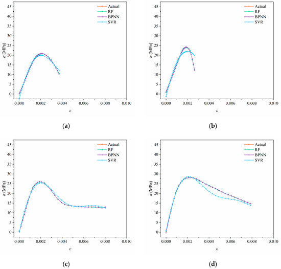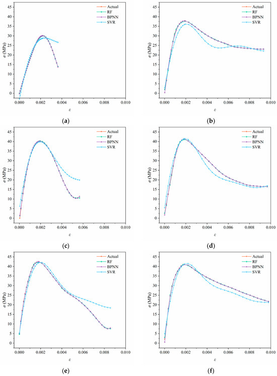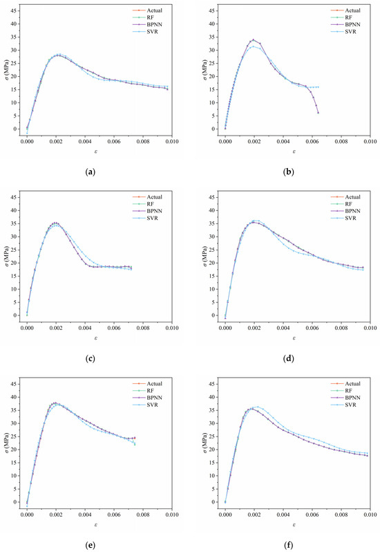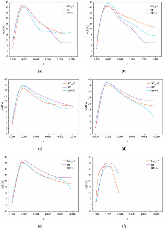 Figure 16 shows the prediction results of the stress–strain relationship of steam-cured SC specimens with SA replacement ratios of 30%, 50%, and 70% by the RF and optimized BPNN prediction models. Meanwhile, Table 4 presents the statistical evaluation metrics of the RF and optimized BPNN models’ predictions of the stress–strain data of nine groups of steam-cured SC.