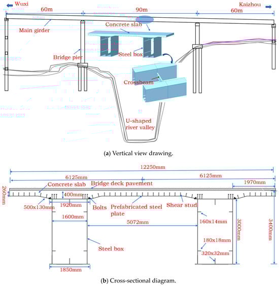The Fenshui River Bridge is an innovative prefabricated assembled composite beam bridge, which stretches over a sharply incised “U”-shaped river valley. Refer to Figure 1. The length of the maximum span of the bridge measures 90 m. The steel box of the composite beam is in a separated form, made up of two steel boxes, and the I-beam cross members are applied to link the steel boxes together. The height from the upper edge of the cross-section to the upper edge of the bottom plate of the steel box is 3.4 m. The height from the upper edge of the top plate of the steel box to the upper edge of the bottom plate is 3 m. The top plate of the steel box has a width of 1.92 m, the bottom plate is 1.85 m wide, and the spacing between the webs amounts to 1.6 m. The ratio of height to width of the steel box is 1.6, falling into the category of a representative cross-section, featuring a big height–width ratio. The steel box has a concise structure, with its web plate being vertical, and stiffening ribs are installed internally. The space between the webs of the two steel boxes measures 5.072 m. The webs of the steel box have a thickness ranging from 14 mm to 20 mm. The thickness of the top and bottom plates lies in the range of 16 mm to 36 mm. The thickness of the concrete bridge slab is between 260 mm and 400 mm. The concrete slab and the steel box are connected by a steel plate with shear studs. The bridge was built via prefabricated construction. The steel boxes are fastened together with bolts. Once the construction of the steel boxes is finished, the bolted steel plates are mounted. Subsequently, the bridge deck concrete is directly cast on the steel plate equipped with bolts. The bridge is situated in an area ranging from 108°44′ to 109°58′ east longitude, and from 31°14′ to 31°44′ north latitude. During the daytime with sunlight, the top plate and one of the web plates of the steel box receive sufficient sunlight exposure.