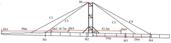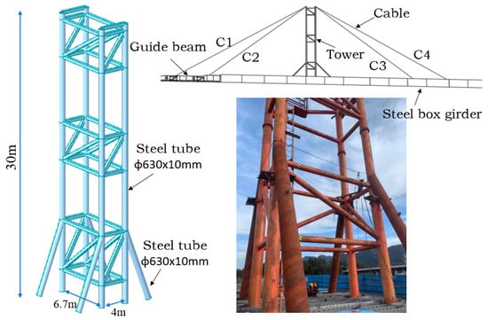 The tower and cable stays were arranged on the steel box girder, and a leading beam was placed at the front of it. This was performed to help the steel box girder successfully span the U-shaped river valley and arrive at the bridge pier in the front. The tower framework is a frame structure constituted by four vertical steel tubes and cross bracings, with the cross bracings being set in three locations. The steel pipe has a diameter of 630 mm and a wall thickness of 10 mm. The tower stands at a height of 30 m. The distance between the steel pipes of the tower in the longitudinal direction of the bridge is 4 m, while the distance between the steel pipes in the transverse direction is 6.7 m. Refer to Figure 3. To strengthen the stability of the tower and decrease the bending moment at the bottom of the tower, tilted steel pipes are arranged at the base of the tower. The stay cables are arranged at four locations, namely C1 to C4. C1 and C2 are arranged on the guide beam, which can effectively increase the launching distance of the bridge. C3 and C4 are symmetrically arranged on the steel beam.