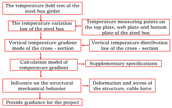 The innovative points of this paper are as follows. Based on the current project, the temperature variation rule of the steel box with a large height–width ratio and straight web that has no pavement layer is investigated. A temperature gradient model is put forward, which makes up for the shortages of the specification. The achievements of this article can serve as a guide for obtaining the temperature gradient value of the steel box featuring a relatively large height–width ratio and straight webs. In the case of the large span steel box girder pushed without auxiliary piers, the impact of the temperature gradient on its stress in the construction process is analyzed, which offers instructions for the safety control in the construction process of the steel box girder.