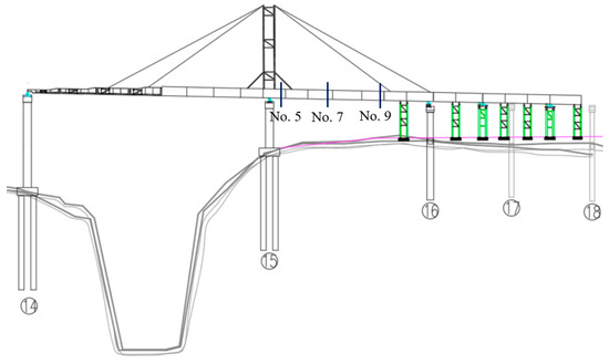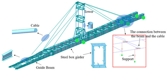 The force-bearing behavior of the structure merits attention [24]. In Figure 5, the guide beam is on the verge of spanning the pier. At this point, the structure is in the greatest cantilever condition, and the stress situation is the most disadvantageous. The FEM is utilized to study the effect of the thermal disparity model put forward in this paper on the structural force. The simulation model for the structure was set up with Midas Civil [25]. Refer to Figure 15. In the model, there are 512 beam elements and 436 nodes. The steel box girder, the guide beam and the tower structure are modeled with beam elements, while the cables are modeled with cable elements. The brackets and bridge piers are at the bottom of the steel box. The weight of the steel box is conveyed to the ground via the brackets and bridge piers. The effect of the interaction between the bottom of the bridge piers and the soil has an impact on the force borne by the structure [26]. But because the bridge is situated in a mountainous region and the pile foundations at the bottom of the bridge piers are directly embedded in the rock, the interaction between the structure and the soil is not taken into account. Thus, the brackets and bridge piers at the bottom of the steel beam are modeled with supports that can only withstand compression, and the bottoms of these supports are made fixed. A rigid connection is adopted to model the connection between the cables and the steel beam. The structural weight, namely the dead load, serves as the primary load action. The weight of the model is adjusted in accordance with the weight specified in the design document. In light of the stress state of the structure, a comparative analysis was conducted on the impacts of the thermal disparity and the structural dead load on the structural stress, deformation, and the force of the cables. The selected cross-sectional positions are marked in Figure 16.