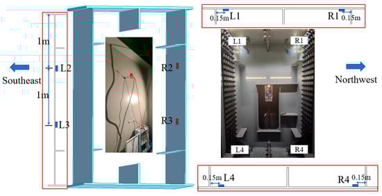 In Figure 10a, the temperature of the measuring points on the top plate of the test section of Steel Box No. 5 rise rapidly starting from 9:00, peak in the time period between 14:00 and 16:00, and, after that, the temperature declines gradually. The highest temperatures at the measuring points L1 and R1 on the top plate are 44.8 °C and 44.5 °C, respectively. The time at which the temperature of the bottom plate of the steel box increases lags behind the time for the top plate’s temperature increase. It commences to increase in temperature at 10:00, attains the highest temperature within the time interval from 15:00 to 17:00; subsequently, the temperature starts to drop. The highest temperature values of L4 and R4 at the bottom plate are 33.5 °C and 31.6 °C, respectively.