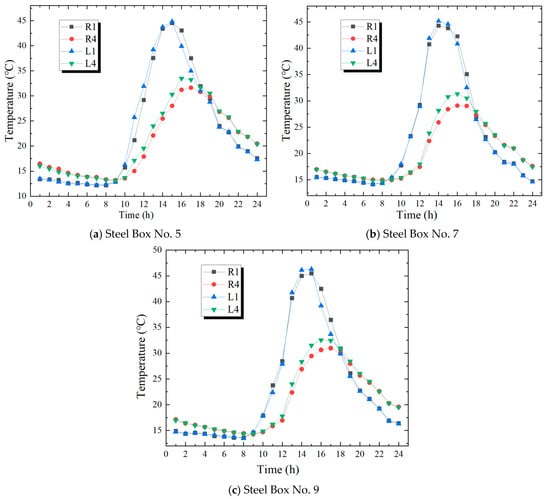 In Figure 10b,c, the changing patterns of the temperatures of the top and bottom plates of Steel Box No. 7 and Steel Box No. 9 are analogous to that of Steel Box No. 5. For Steel Box No. 7, the highest temperatures of L1 and R1 on the top plate are 45.2 °C and 44.5 °C, respectively. And the highest values of L4 and R4 on the bottom plate are 31.3 °C and 29.1 °C, respectively. The highest temperatures of L1 and R1 on the top plate of Steel Box No. 9 are 46.3 °C and 45.5 °C, respectively. The highest values of L4 and R4 on the bottom plate are 32.5 °C and 30.6 °C, respectively.