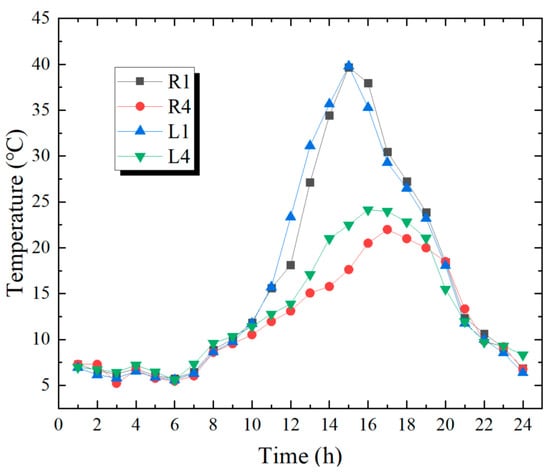 The temperature results were collected continuously throughout a 24 h period, commencing at 0:15 a.m. The collection interval was set at 15 min. The temperatures at the measuring points of each test cross-section were gathered at the same time and in synchronization, guaranteeing that there was no temporal discrepancy in the temperature data of every measuring point.