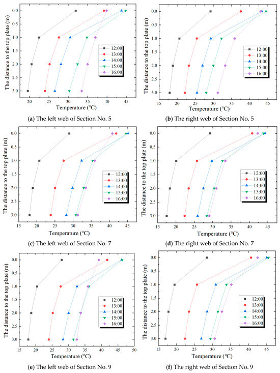 In Figure 12a,b, regarding the left web of the No. 5 steel box, during the time from 12:00 to 16:00, the variation in temperature of the cross-section is between 6.5 °C and 17.2 °C, and the largest temperature difference, which is 17.2 °C, appears at 14:00. Regarding the right web, during the time from 12:00 to 16:00, the variation in temperature of the cross-section varies between 11.3 °C and 17.9 °C, and the largest temperature difference, being 17.9 °C, appears at 14:00. The thermal disparity of the right web is greater than that of the left web, and this is associated with the sunlight exposure. In Figure 12c,d, regarding the left web plate of the No. 7 steel box, during the time from 12:00 to 16:00, the variation in temperature of the cross-section is between 9.5 °C and 17.1 °C, with the largest temperature difference being 17.1 °C at 14:00. Regarding the right web plate, within the time period from 12:00 to 16:00, the thermal disparity of the cross-section varies between 11.8 °C and 18.4 °C, and the largest temperature difference, which is 18.3 °C, occurs at 14:00. In Figure 12e,f, concerning the left web plate of the No. 9 steel box, during the time from 12:00 to 16:00, the temperature difference in the cross-section varies between 6.7 °C and 17.8 °C, with the largest temperature difference being 17.8 °C at 14:00. For the right web plate, within the time period from 12 o’clock to 16 o’clock, the cross-sectional thermal disparity ranges from 11.5 °C to 18.1 °C, and the largest temperature difference is 18.1 °C at 14:00. At 14:00, the average values of the temperature differences between the two side webs of the steel boxes at three distinct positions are 17.6 °C, 17.7 °C, and 17.9 °C, respectively. Despite the different locations, the vertical temperature differences in the cross-sections show little variation.