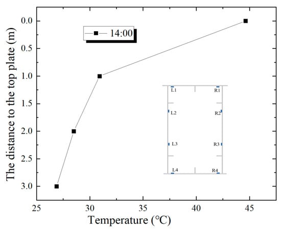 In Figure 12, the temperature measuring points in the test sections of every steel box show the feature of non-linear distribution along the vertical orientation of the section. In the range of 1 m from the top plate, there is a significant difference in temperature values. In the range between 1 m and 3 m from the top plate, the variation in temperature is slight, and the curve has a distinct inflection point at the 1 m mark. Furthermore, the thermal gradient of the steel box girder resulting from solar irradiation is not a constant value, and it is at its peak at 14:00.